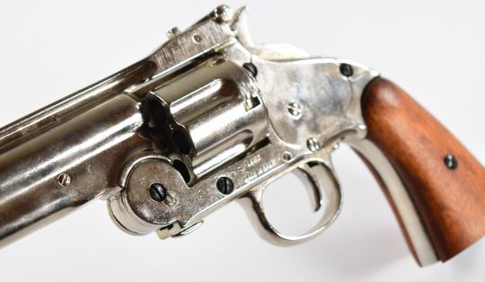 Three Denix BKA and similar replica revolvers including Schofield LeMat and one with ornate decoration and faux ivory grips, largest 36cm long.