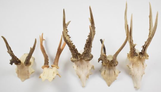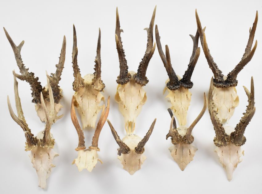 Ten taxidermy roe / muntjac deer skulls with antlers, largest 39cm