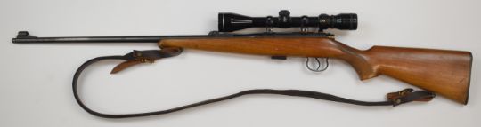 BRNO Model 2 .22 bolt-action rifle with chequered semi-pistol grip, multi-shot magazine, leather sling, Tasco 3-9x40 scope and 24.5 inch barrel, overall length 109cm, serial number 195868. PLEASE NOTE THAT A VALID RELEVANT FIREARMS/SHOTGUN CERTIFICATE IS REQUIRED TO HANDLE/PURCHASE THIS ITEM.