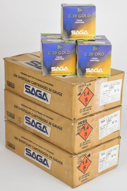 Eight hundred and seventy five 20 bore Saga Gold 24g steel 4 shot cartridges, all in original boxes. PLEASE NOTE THAT A VALID RELEVANT FIREARMS/SHOTGUN CERTIFICATE IS REQUIRED TO HANDLE/PURCHASE THIS ITEM. We are not able to offer our usual postage service for this lot