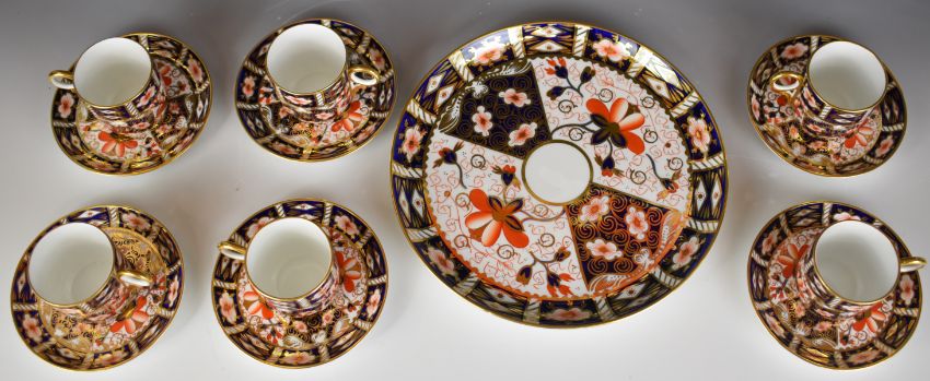 Royal Crown Derby Imari coffee ware decorated in the 2451 pattern, comprising six cups and saucers and a circular tray