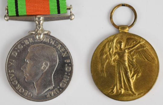 British Army WW1 Victory Medal named to 4472 Pte J W Richards, Royal Welch Fusiliers, together with a relative's WW2 medal trio comprising 1939/1945 Star, Defence Medal and War Medal, with postal box to J S Richards, Montgomeryshire and Air Ministry return address