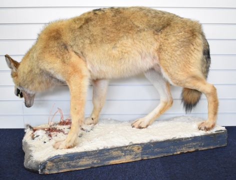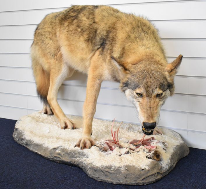 WITHDRAWN Taxidermy study of a wolf with teeth bared, raised on a naturalistic snow covered base, with the remains of a kill. Provenance: The hunting and killing of this wolf was documented in a four page feature in 'The Field' magazine and a Cites certificate was issued in the Russian Federation, W135 x D56 x H82cm