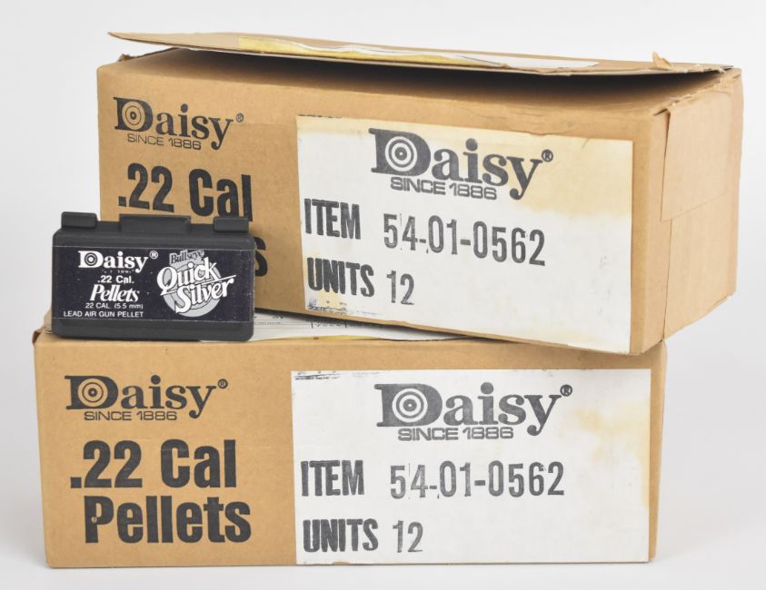 Twenty-four tins of 250 .22 Daisy Bullseye Quick Silver air rifle pellets, all sealed in original boxes.
