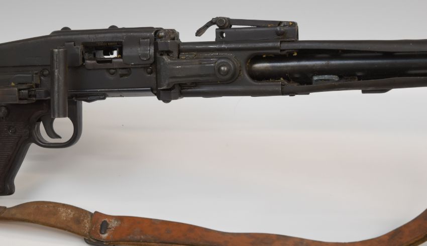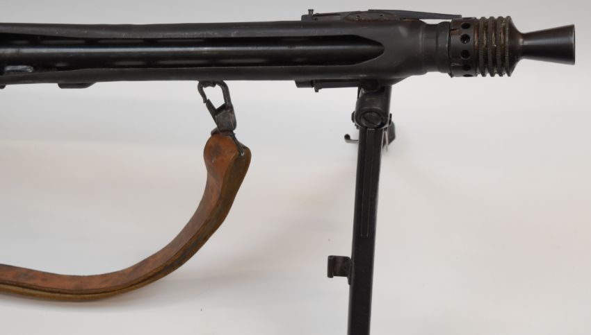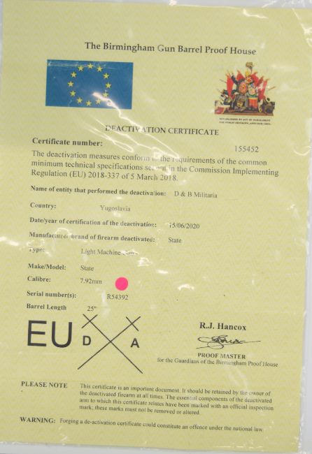 Deactivated Yugoslavian MG53 7.92mm light machine gun with frame stamped '7.9 M 53 R-54392' and with foreign script, pistol grip, bi-pod, stock stamped 'S-111-23380 39727', top plate stamped 'GPJ R-54392' and with Yugoslavian emblem, leather sling and 25 inch barrel, overall length 121cm, serial number R54392, with metal barrel and drum magazine holders and deactivation certificate dated 15/06/2020.