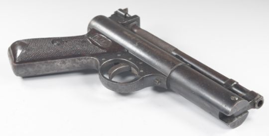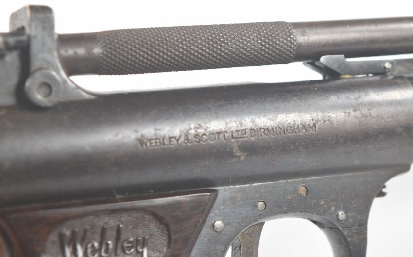 Webley Premier .22 air pistol with named and chequered Bakelite grips and adjustable sights, serial number 250.  PLEASE NOTE:- Before bidding please ensure that you are fully aware of any law regarding ownership and of any limitations on shipping of this item