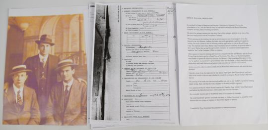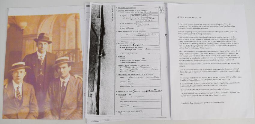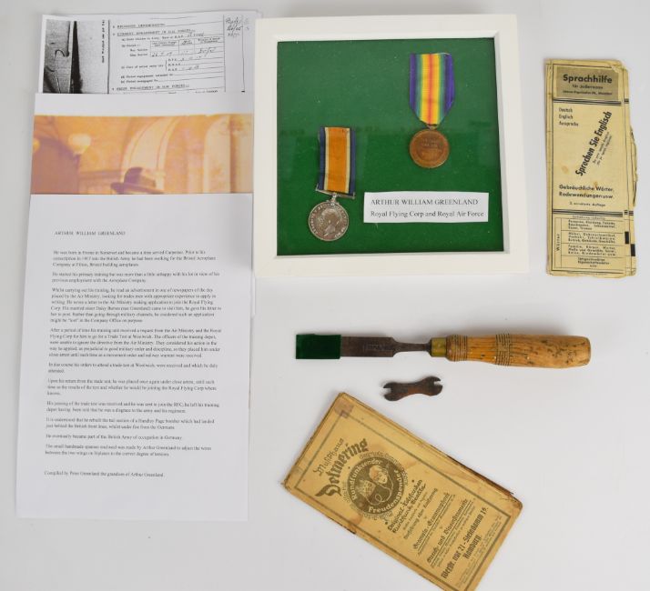 Royal Flying Corps / Royal Air Force WW1 medal pair comprising War Medal and Victory Medal named to 104121 I.A.M A.W Greenland RAF, with copy service records, homemade spanner for cable adjustment and chisel dated 1918, a post war German map of Hamburg and a phrase leaflet