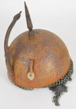 Steel helmet with chain mail neck protector, spike, plume holders and fixed nose guard