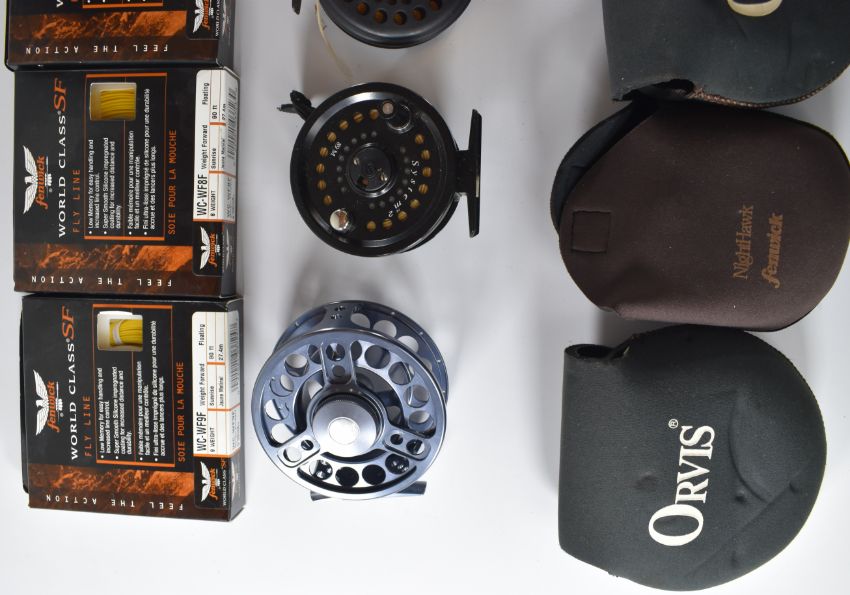 Fly fishing reels and lines, Abu Ambassadeur 6600C5 Mag-X, Orvis, Scientific Angler, Scierra reels including System 2 and Nighthawk, some boxed or in soft pouches and unused and seven Fenwick SF fly lines, mostly WF 8/9 and floating
