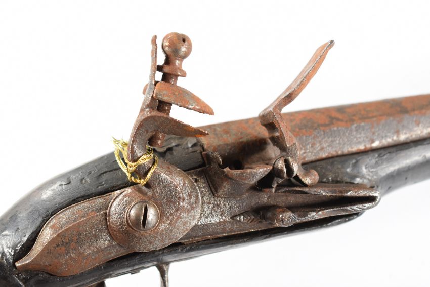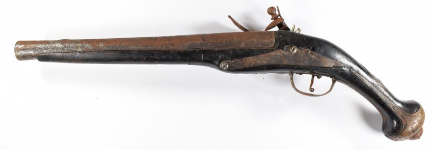 Flintlock holster pistol with steel trigger guards, butt cap and mounts and 11.5 inch part-octagonal smooth bored barrel, overall length 48cm.
