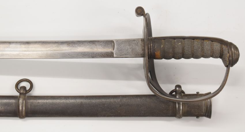 British 1827 pattern Infantry Rifle Regiment Officer's sword with strung bugle to Gothic hilt, shagreen and wire grip, 82cm single edged fullered decorated blade and scabbard PLEASE NOTE:- Before bidding please ensure that you are fully aware of any law regarding ownership and of any limitations on shipping of this item
