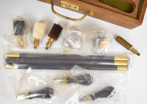 12 bore shotgun cleaning kit with ebony and brass rods, chrome oil bottles etc, unused in hardwood case and card outer box.