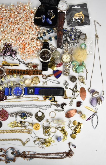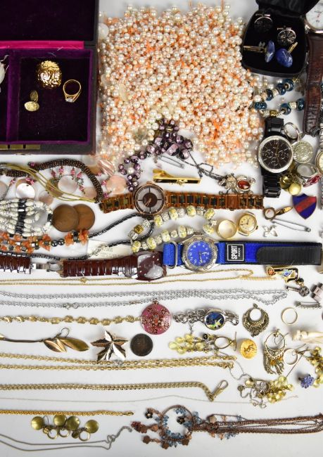 A collection of costume jewellery including Kenneth Cole watch, silver pendant, Skagen watch, 9ct gold 'special mum' pendant (0.3g), 9ct gold damaged chain (0.3g), two 9ct gold rings (2.5g), silver ring, etc