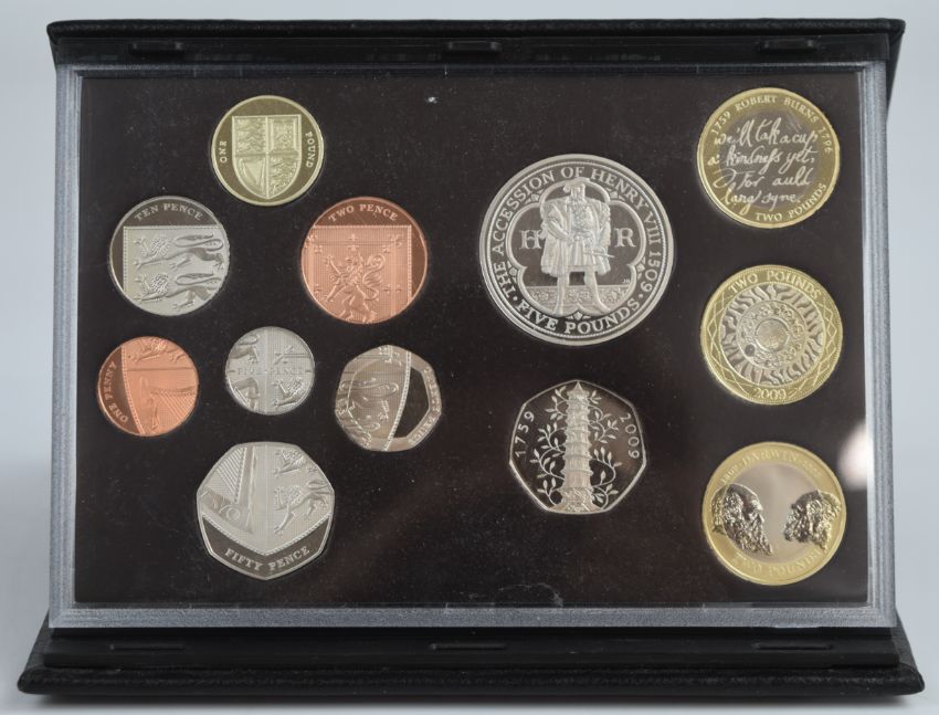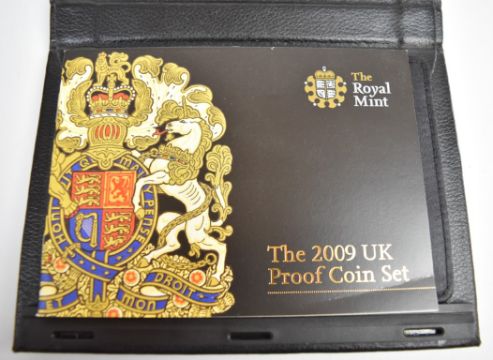 Royal Mint 2009 proof coin set comprising 12 coins from £5 to one penny, including Kew Gardens 50p, in original leather pouch with booklet