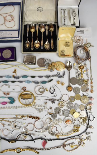 A collection of costume jewellery including silver gate bracelet, cufflinks, coins, book vesta, silver chain, diamanté, etc