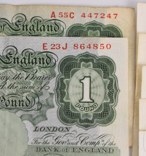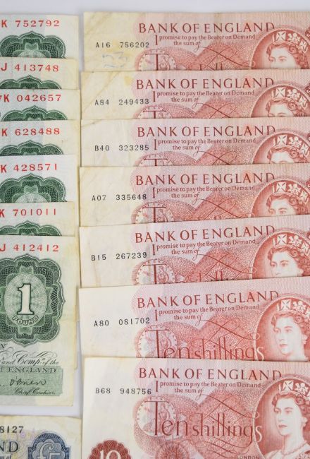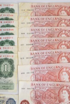 Bank of England banknotes comprising Fforde £10, O'Brien £5, sixteen £1 notes comprising two Beale and fourteen O'Brien including a consecutive run of seven and ten O'Brien ten shilling notes