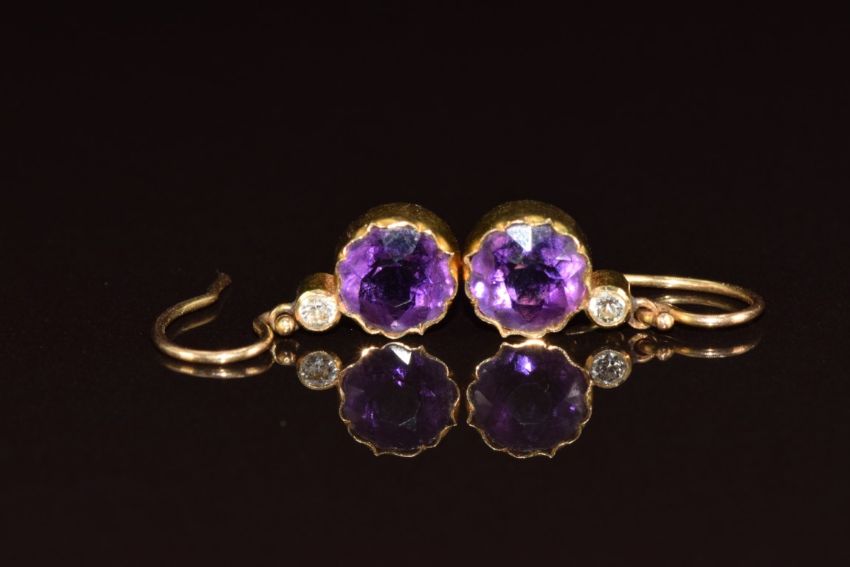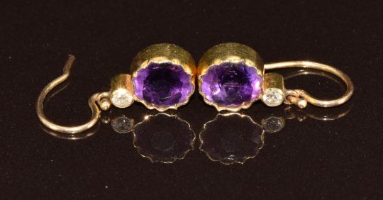 Edwardian pair of yellow metal earrings each set with a round cut amethyst and diamond (test as 9ct gold), 1.8g