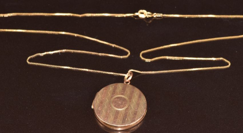 A c1920 9ct gold locket (2.3cm) on 9ct gold chain, 4.2g