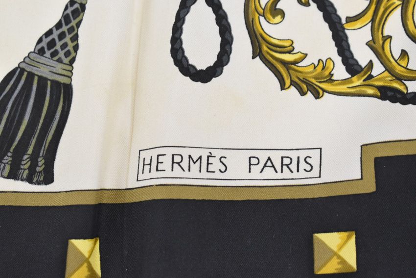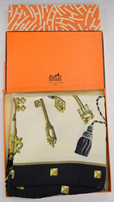 Vintage Hermès silk scarf 'Les Cles' designed by Cathy Latham, 90x90cm, in original box