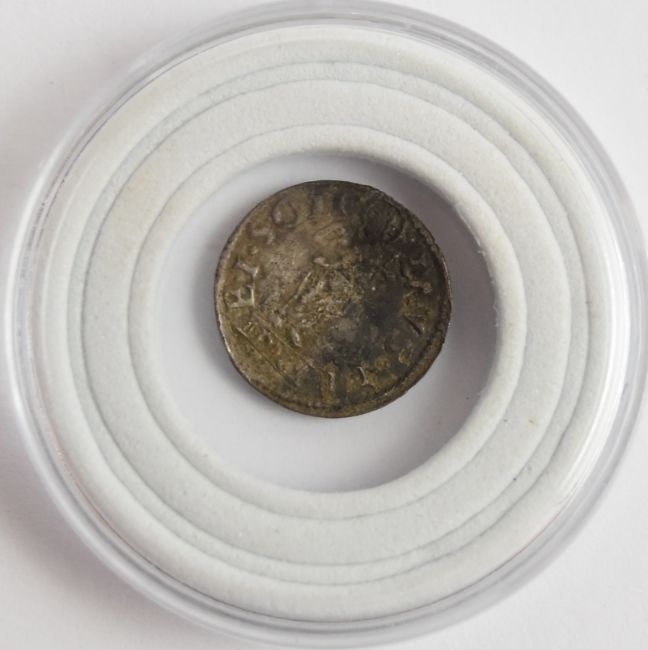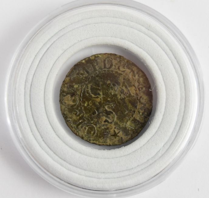 A small silver continental / crusader type circa 16thC coin and two circa 17thC provincial copper farthing tokens, one for Campden