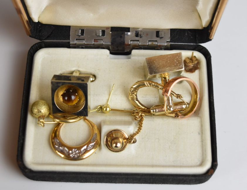 A collection of jewellery including silver chain, silver earrings, brooches, single 9ct gold earrings (4g), three silver rings, two silver necklaces, etc