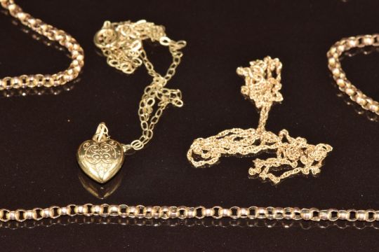 Three 9ct gold chains and heart pendant, 7.9g, 46, 40 & 46cm
