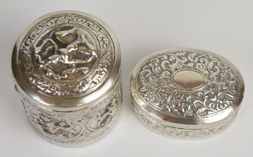 Two Burmese or similar silver pots, one with embossed decoration of deities, height of larger 8cm, weight of both 225g
