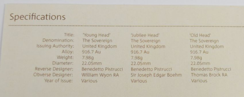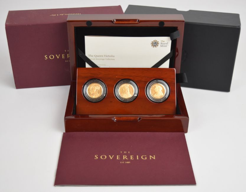 Royal Mint limited edition (number 153) set of three Queen Victoria gold full sovereigns comprising 1871 young, 1892  jubilee and 1896 old head examples, the old head example having Melbourne Mint mark, with Royal Mint certificate