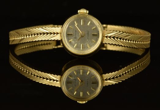 Accurist 9ct gold ladies wristwatch with gold hands and hour markers, silver dial and signed 17 jewel movement, on integral 9ct gold bracelet, case diameter 17mm, 18g.
