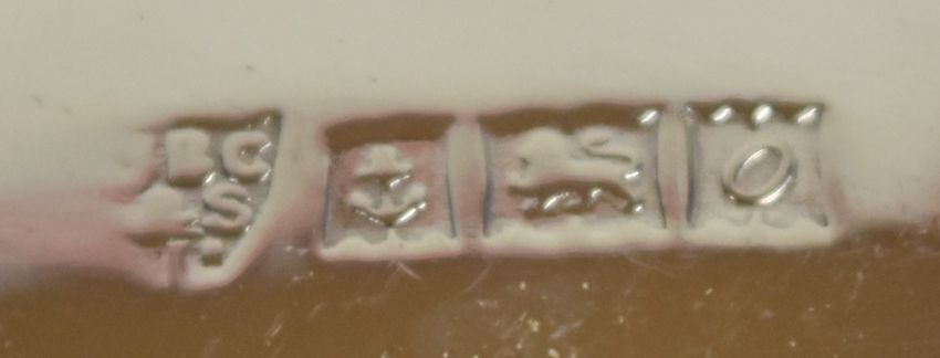 Hallmarked silver salts, mustard and pepper comprising a pair of circular examples and a four piece set with spoons, length of longest 8.5cm, weight of all items excluding blue glass liners 202g