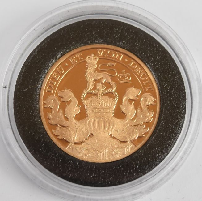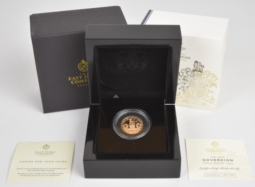 East India Company cased limited edition (327/750) proof 2023 King Charles III gold full sovereign, with East India Company and Coin Portfolio Management certificates