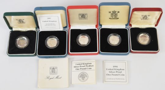 Five Royal Mint cased limited edition silver proof £1 coins comprising two 1983, 1987 Piedfort, 1994 and 2002, all but one with certificate