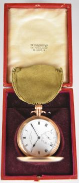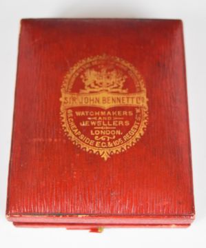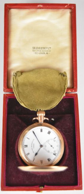 Sir John Bennett Ltd of London The Spartan 9ct gold keyless winding full hunter pocket watch with subsidiary seconds dial, blued hands, black Roman numerals, white dial and signed 15 jewel movement, case diameter 50mm, serial number 2222, 90g, in original fitted box.
