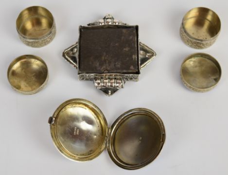 Four trinket boxes including Art Deco hallmarked silver and blue guilloché enamel example, Birmingham 1928, maker Henry Matthews, diameter 5.5cm and two further enamel decorated examples marked Siam