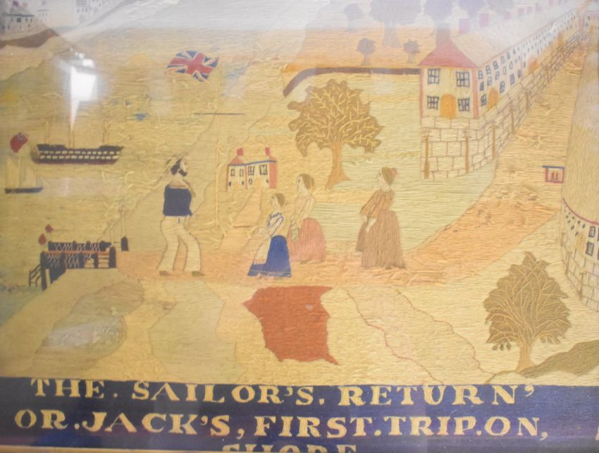 18th /19thC wool work / embroidery entitled 'The Sailor's Return or Jack's First Trip on Shore', depicting a bearded matelot being greeted by three women, ship and anchor flying the red ensign and a street of houses, 45 x 66cm in satinwood frame, 57 x 72cm