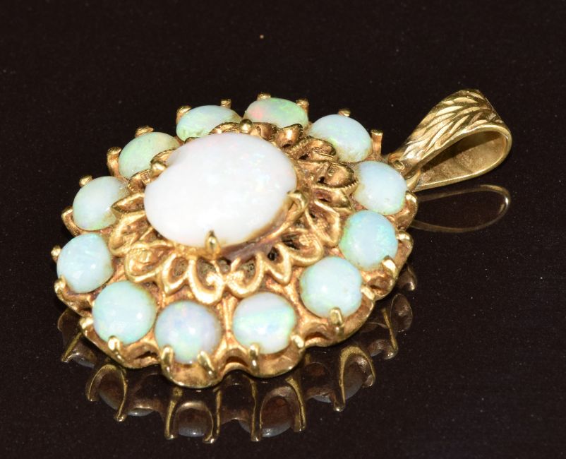 An 18ct gold pendant set with opals, 5.9g, 1.6 x 3cm