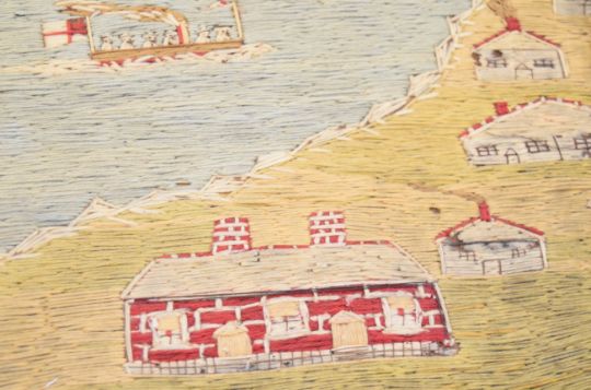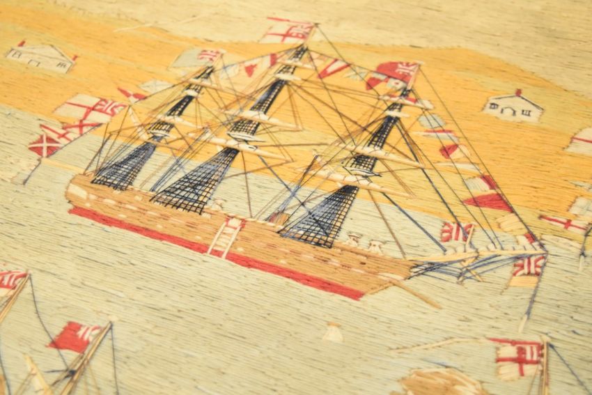 Late Georgian / William IV Royal Navy interest large wool work or embroidery of ships of the line, including paddle steamer (probably a frigate) and steam tender, the ships bedecked with flags and anchored in harbour with lighthouses on the headlands, houses and hills beyond, the scene probably a return to port / homecoming. Note: paddle steamships entered service c1815 and were rendered obsolete by screw propulsion c1845. Embroidery 54 x 97cm, frame 70 x 114cm