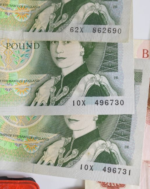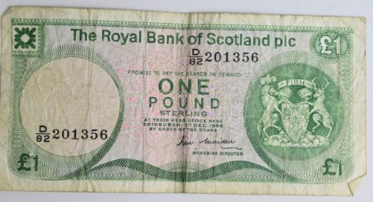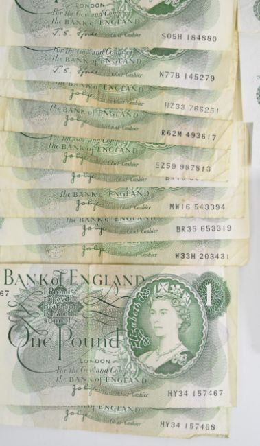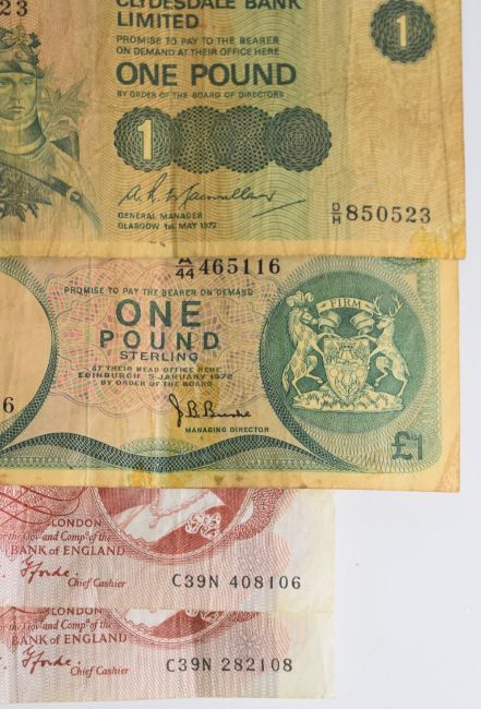 1889 and 1900 Victorian crowns, 1921 and 1936 half crowns, 1970, 1973 and 1977 Dutch 10 Gulden 720 silver coins, 14 Bank of England £1 notes comprising 12 Page and 2 Fforde, three various Scottish £1 notes and two Fforde 10 shilling notes