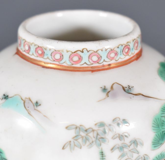 Pair of early 20thC Chinese baluster vases with enamelled lake / river decoration with figures and boats, two character marks to bases, H14cm