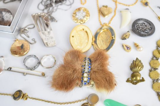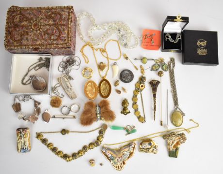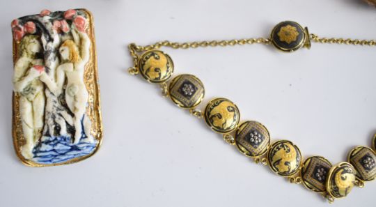 Costume jewellery including silver brooch, Japanese bracelet, silver locket with engraved swallow and ivy decoration, silver locket, silver bracelet, 9ct gold locket with heart decoration (Birmingham 1918), four pieces of Maralyn Reed-Wood porcelain jewellery, etc