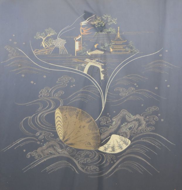 19th / 20thC Chinese embroidery of seashells and waves inundating a settlement, possibly a typhoon / tsunami, Frost & Reed label verso, 69 x 65cm
