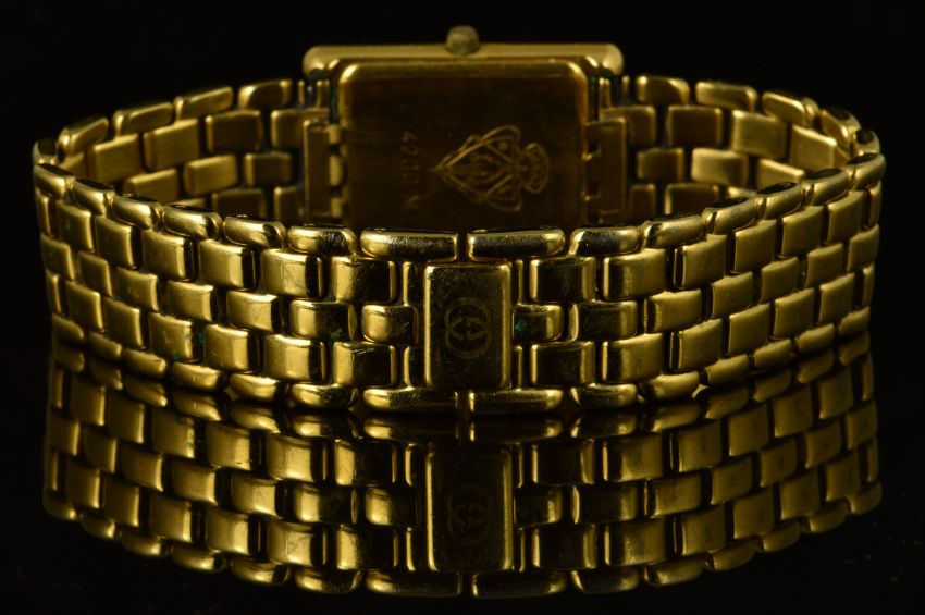 Gucci gentleman's wristwatch ref. 4200 M with gold dauphine hands, black dial, Roman numerals to the bezel, gold plated case and quartz movement, on gold plated bracelet, case diameter 24mm, in original box with guarantee card and paperwork.