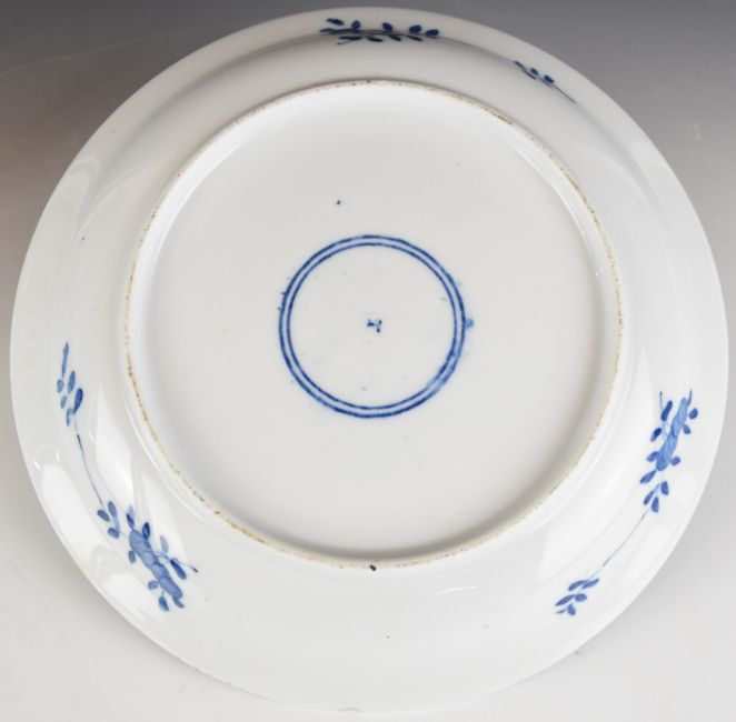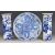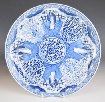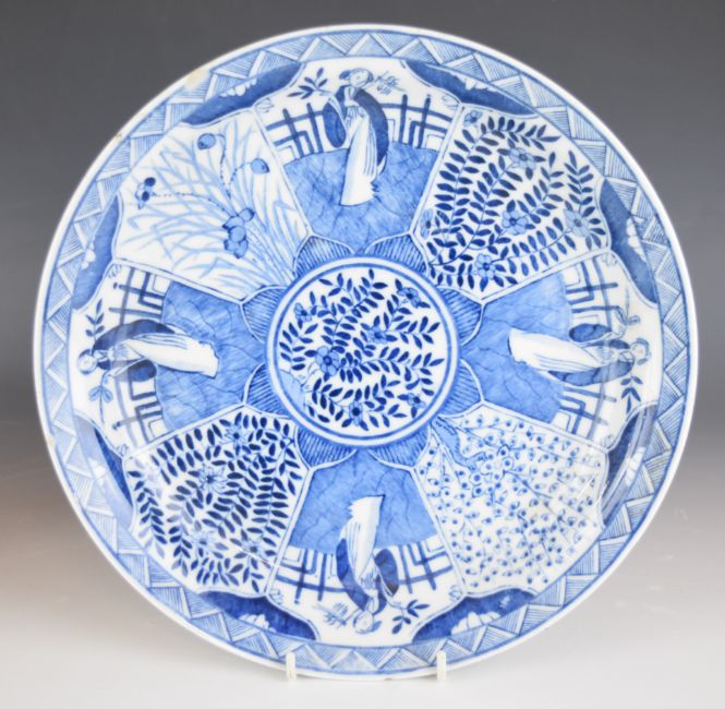A pair of 19th/20thC blue and white sleeve vases with figural decoration and four character mark to base, H26cm together with a shallow dish, diameter 27cm