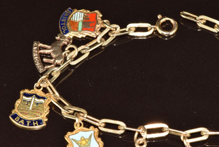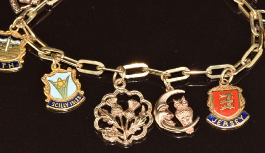 A 9ct gold charm bracelet with nine charms including enamel set thistles, moon & owl, etc, 16.7g, 18.5cm