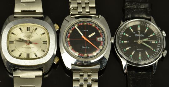 Three vintage gentleman's wristwatches Timex Electric with date aperture and racing dial, Memocall with alarm and silver dial and Sekonda with alarm and grey dial, largest case diameter 40mm.