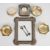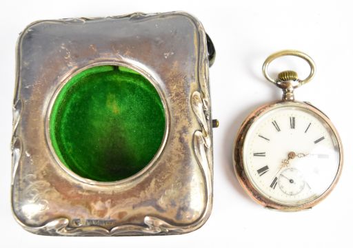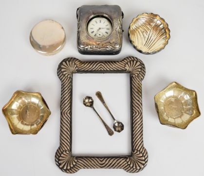 Three Italian silver trinket dishes, all with 800 grade marks, similar 925 grade trinket pot and two hallmarked silver salt spoons, weight of all these items 90g, together with a hallmarked silver photograph frame and a hallmarked silver pocket watch holder