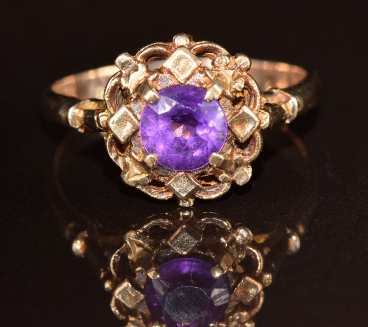 A 9ct gold ring set with a round cut amethyst, 3g, size P