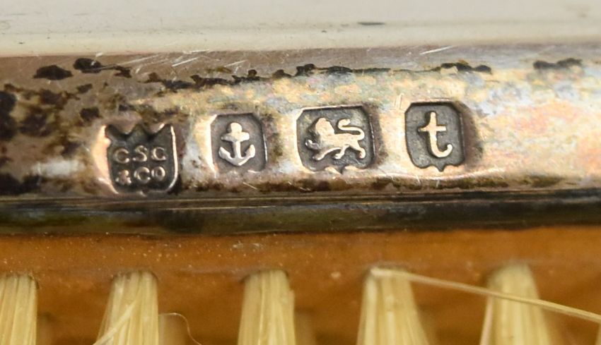 Three hallmarked silver mounted brushes, Birmingham 1918, maker Charles S Green & Co Ltd, length of longest 25cm