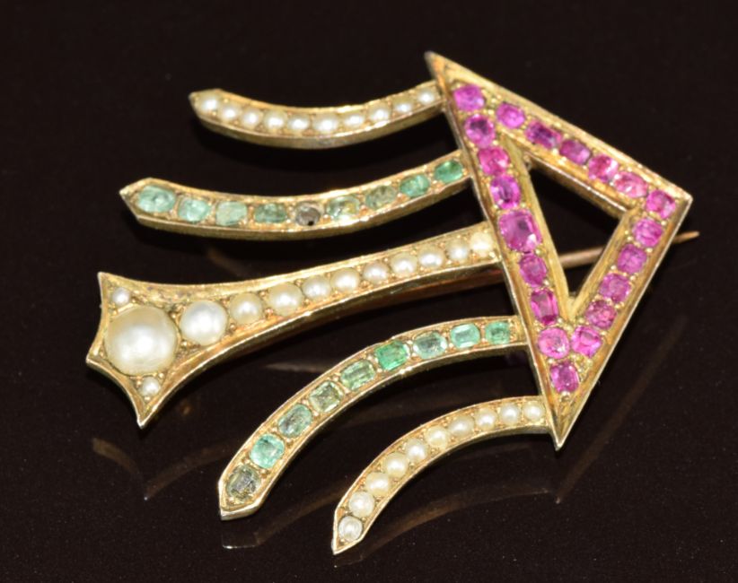 A c1900 gilt brooch set with pearls, emeralds and pink sapphires (4 x 3.4cm) and a 9ct gold brooch (0.9g)
