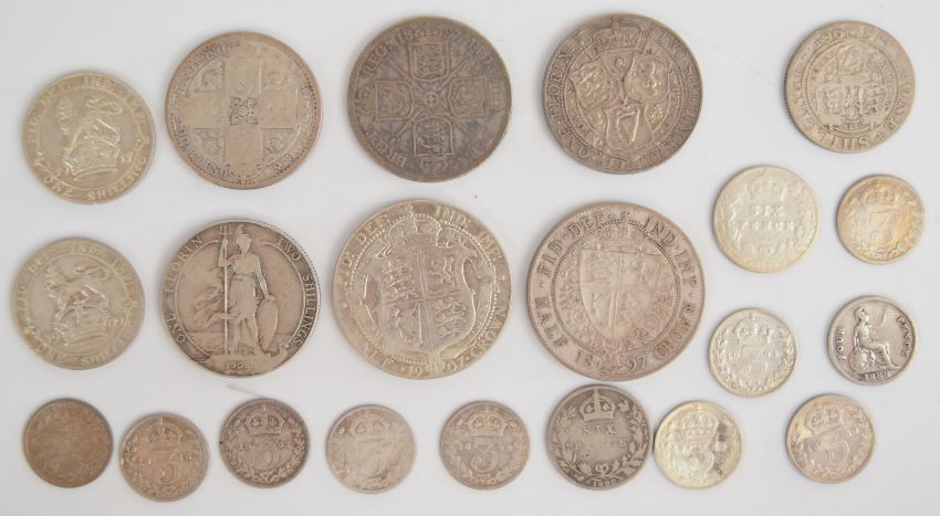Victorian and Edward VII coinage including veiled head, 1907 half crown, 1908 shilling, weight 108g